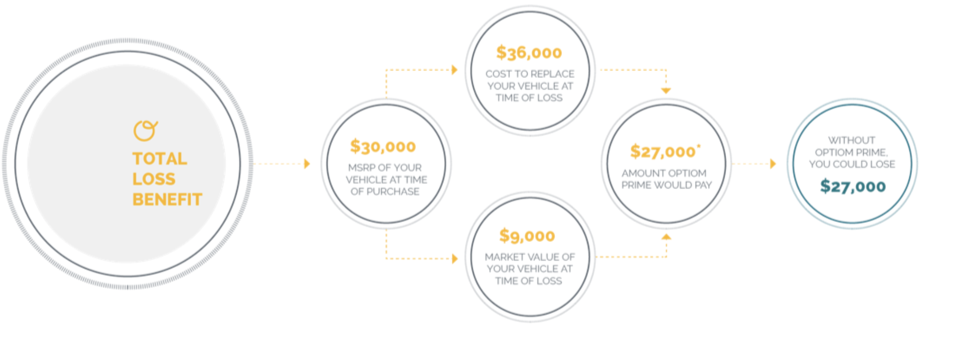 Optiom Prime will pay the difference between the market value of your vehicle at the time of the loss and the MSRP of a brand new, equivalent model replacement vehicle.