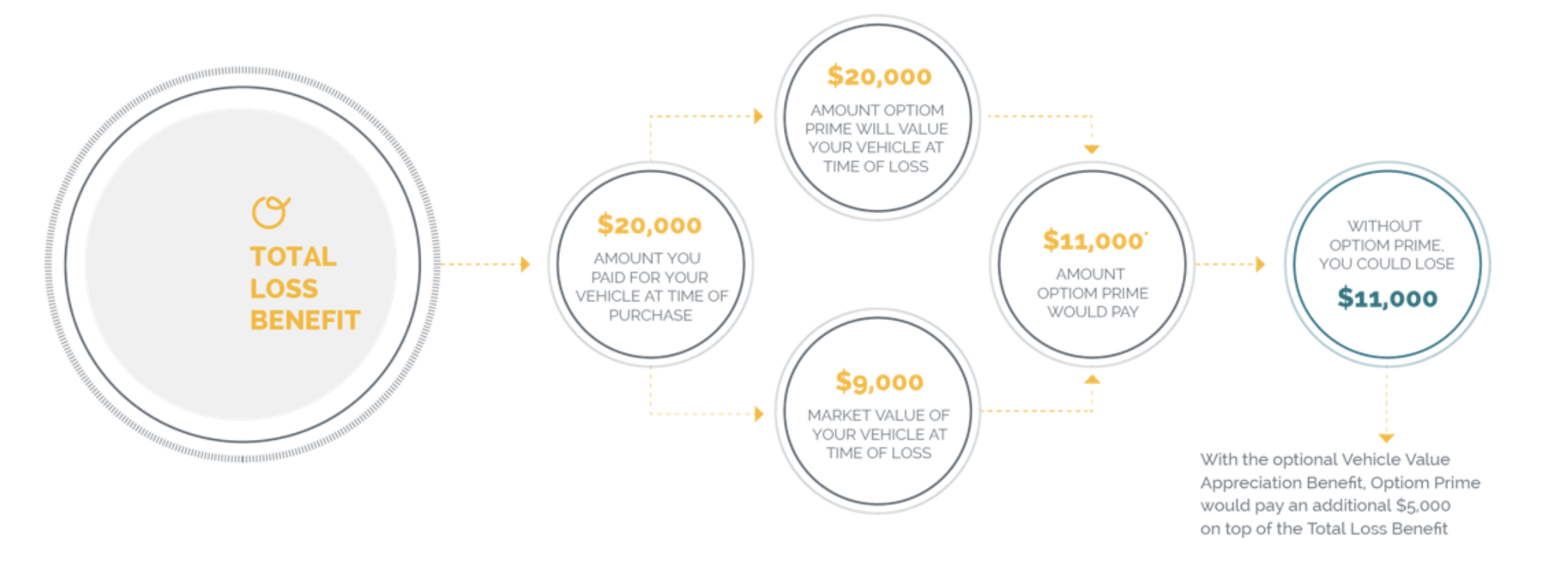 Optiom Prime will pay the difference between the market value of your vehicle at the time of the loss and your vehicle’s value when the policy was taken out.